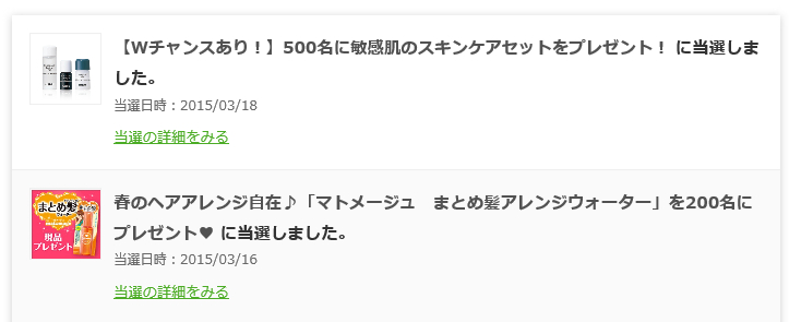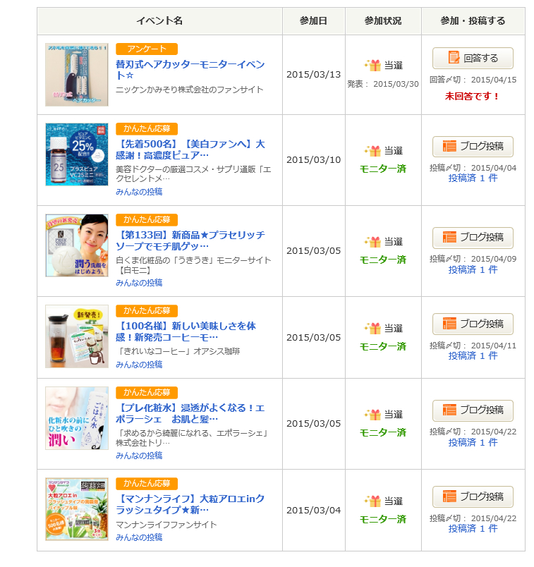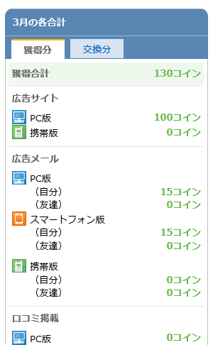 2015/03/31 Category : お小遣い 3月のお小遣い 3月のお小遣い記録。モッピー 今月はとっても貯めれました!ずっと作りたかったPontaをようやく作ったのでリクルートIDとコネクトしました。これだけで550ポイントもらえるんだから超お得。お財布.com 今月もほとんど触りませんでしたが、地味に溜まってます。nanacoさんに交換できるのでまたちょこちょこ触っていきたいです。マクロミル 今月もたくさん案件が来て交換できました!!毎月安定して一定額稼げるのは本当にありがたいですね。ドリームニュース思った以上にポイントがたまりやすくていい感じです。もっと案件来てくれると嬉しいのだけど贅沢かな。メールにすぐ気付けないと定員いっぱいになってしまうので。でもブログのネタにもなるのでとっても助かってます。先月分を引くと1968円ですね。あと下に記しますが、auスパートパスでいろんな無料クーポン当たりました!モッピーにauスマートパスの広告があるのですが、そっちから登録するともっとお得です。この間見た時は3000ポイントとかになってた。既に登録したことのある方も、再登録でポイントがつく見たいです!メルカリは売上ポイントでたくさん買い物してしまったので換金はまだ先かな?と思ったのですが、今月も10000円換金できました!!お買い上げいただけて本当にうれしいです。大切に使ってあげてください!!お小遣い系の合計金額は18299円でした!↓今月当たった懸賞・モニター モニプラ…白くま化粧品 プリエネージュ(抽選:50名)/オアシス珈琲 カップインコーヒー(抽選:100名)/エポラーシェ ごはん水(抽選:100名)/エクセレントメディカル(先着:500名)/マンナンライフ 蒟蒻畑(抽選:500名)/ニッケンかみそり 替え刃式ヘアカッター(抽選:100名) ポチカム…アクセーヌ AD コントロール/マトメージュ まとめ髪アレンジウォーター(抽選:200名)BOSSVEGAS…BOSS6缶アソートセット(抽選:700名) auスマートパス…ファミリーマート メッツ無料引換券(抽選:30000名)/ローソン ウチカフェ プレミアムぎゅっとクリームチーズ 無料引換券(抽選:222222名)/ローソンセレクト500mlペットボトル 無料引換券(先着:222222名)/ファミリーマート 口どけなめらかカスタードシュー 無料引換券(抽選:200000名)/クリアアサヒ無料引換券(抽選:60000名)/シュウェップス シトラス(抽選:200000名) AYURA…肌ほぐし体験!サンプリングキャンペーン 美容化粧液(抽選:25000名)HAKU…美白化粧水・乳液(抽選:150000名)STEAMCREAM…ハンドクリーム 無料サンプル(応募者全員) エッセンシャル…シャンプー・コンディショナー 無料サンプル(先着:90000名) SUNSTAR…Ora2 ブレスファイン マウススプレー 新・体験"瞬間クリア、息メイク" 10000人モニターキャンペーン(抽選:10000名) Keinz…生シアバター サンプル(応募者全員) est…ファンデーション ユースキン…ハンドクリーム サンプル(応募者全員)revanche…サンプル(応募者全員) Georgia…エメラルドマウンテン(先着:10000名) フレンテインターナショナル…スーパークリッシュ(先着:1000名) 井藤漢方薬品…プロテオグリカンコラーゲン(抽選:1000名)